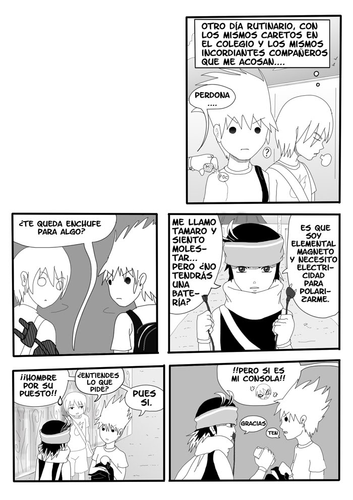 Ha costado bastante decidir el Manga ganador. Como sabéis, algunos Manga que ya habéis presentado a estas ediciones anteriores aparecerán en el libro de Mundo Elemental y claro, rebuscando entre los finalistas cuesta bastante decidir quién va en un sitio y quién va en otro. Al final se ha decidido que sea este simpático trabajo de Red-shadow-227 el que aparezca en el tomo 4, que muestra una divertida historia de Kaji y Zap conociendo a un elemental de magneto un poco gorrón y que está muy bien dibujado.