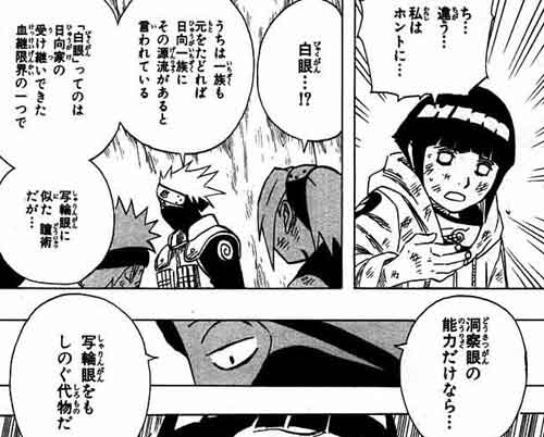 [Fragmento de Naruto, 9 - Original japonés]"Uchiha ichizogu mo moto o tadoreba Hyuuga ichizogu ni sono genryuu ga aru to iwareteiru [Byakugan] tte no wa Hyuugake no uketsui dekita kekkei genkai no hitotsu Sharingan ni nita doujutsu da ga…".