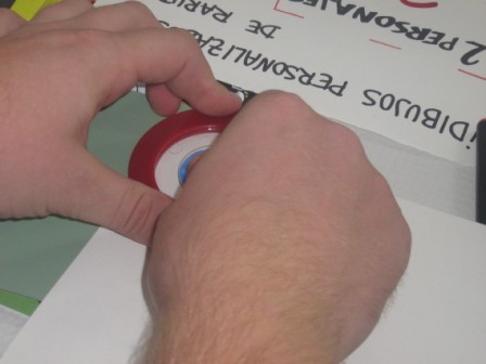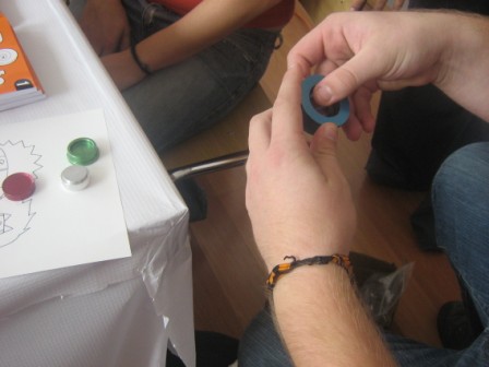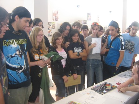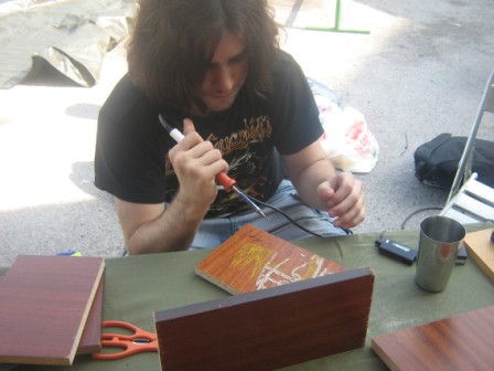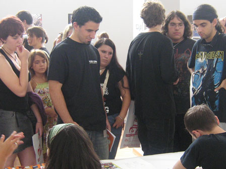 Llegamos por la mañana, antes de que abrieran, por suerte, y comenzamos a montar el stand. En é, las nuevas ediciones de "Viaje al país Blanco-Blanco", dibujos a punta pala y la jugosa y codiciada novedad: el Tomo 1 de Raruto. El enigma en esta ocasión eran las c----- p-------------, que resultaron ser las chapas personalizadas, gracias a la míquina de hacer chapas que trajo Red_HoOk. Fue bastante divertido: tu decías, "quiero una chapa de Saske", y yo hacía el dibujito, lo pintaba y Red_HoOk te hacía la chapa en 10 segundos con extraños movimientos. ¡Y todo el mundo con su chapa!