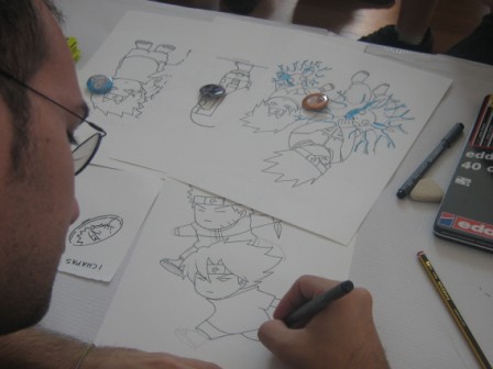 Un día un poco mís calmado, pero no por ello sin emociones fuertes. Una mañana llenísima de dibujos, la gente estuvo muy animadas. Las chapas y los dibujos volaban (no por la sala, sino que hacía muchos) y Red_HoOk (como no) tuvo la grandiosa idea de sortear nuestro mega-póster de Raruto "Pichori-Pirulo" tamaño A2 y a todo color. Fue una de las actividades curiosas, ademís del juego de las Olimpiadas de "Hazte una foto con Vero y Txetxi", claro.